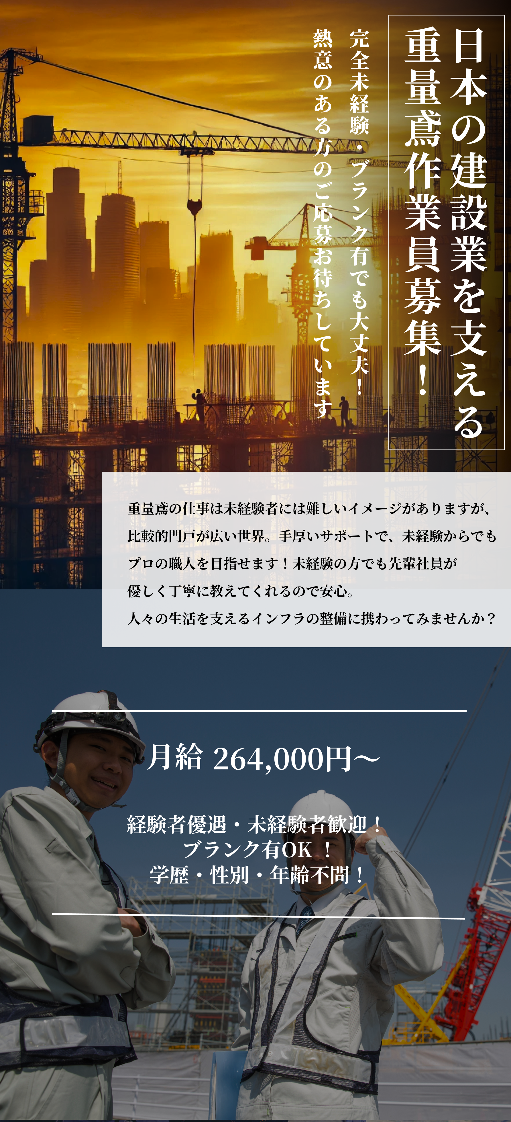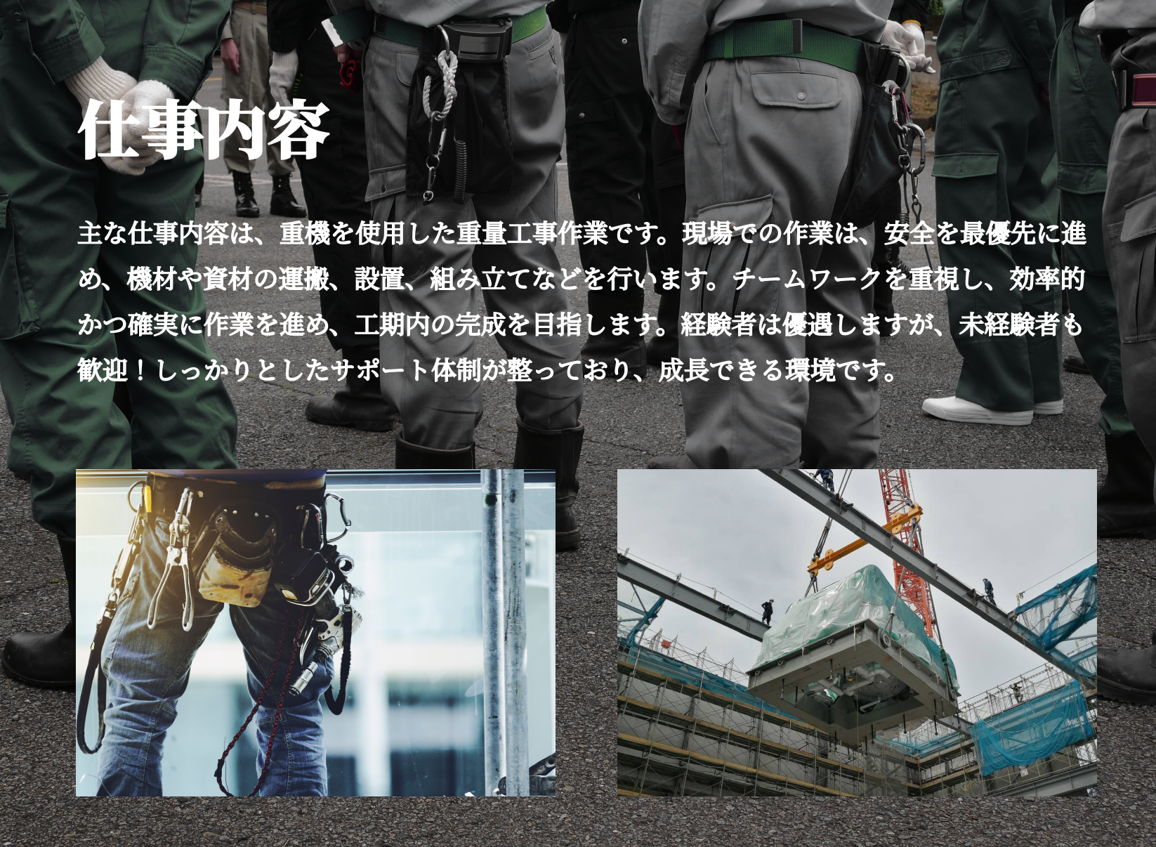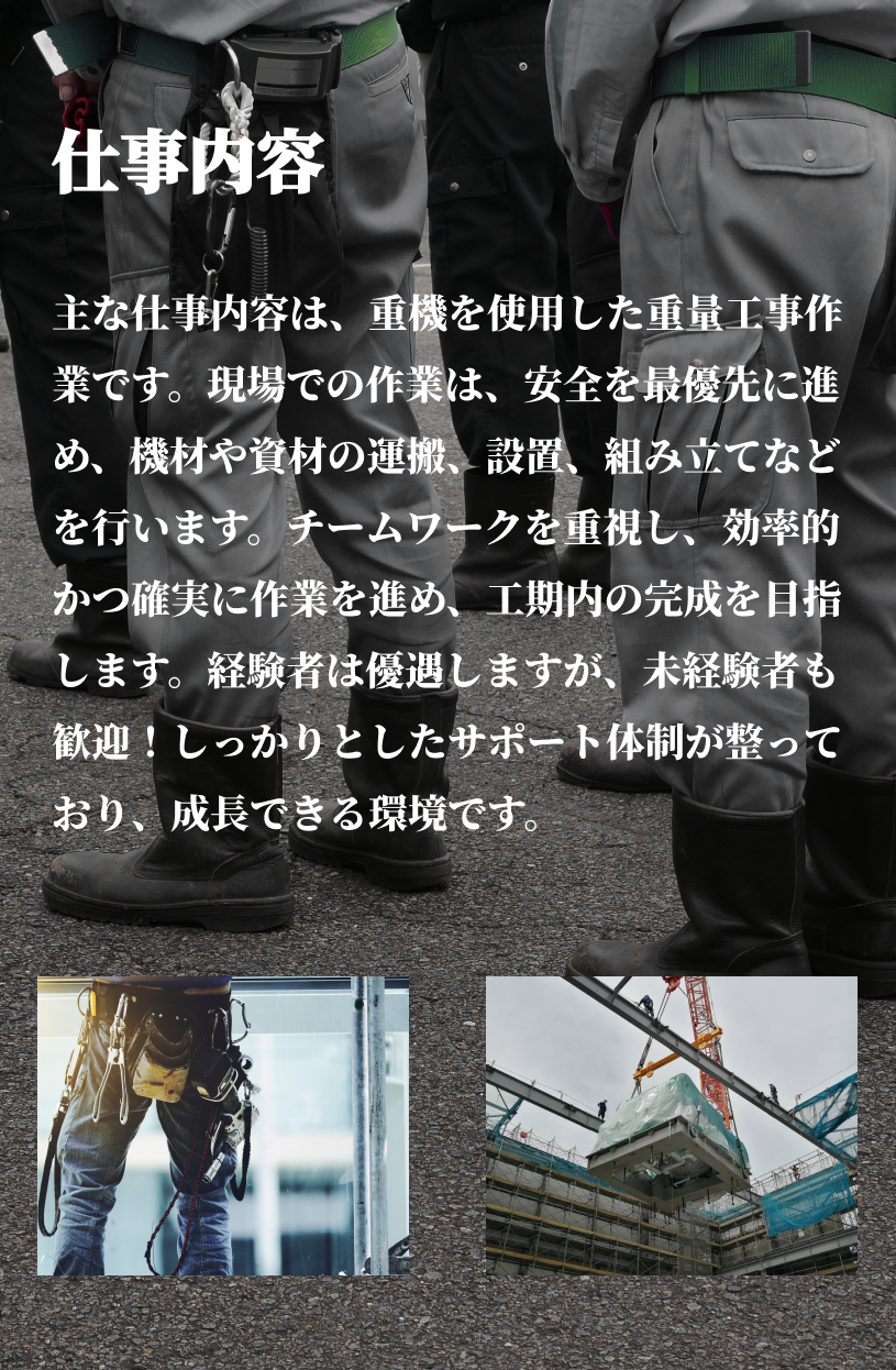 経験者優遇・未経験者歓迎 普通自動車運転免許(AT限定可) 玉掛けの免許あれば尚可 ブランク有OK 学歴・性別・年齢不問 |